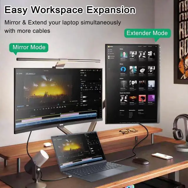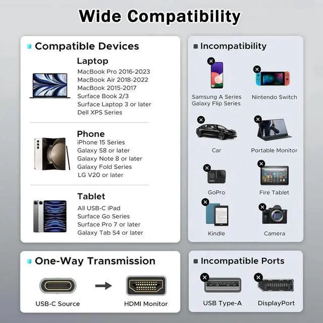 Compatible with: Designed for Type C ports with video output capability (DP Alt Mode) and Thunderbolt 3 & 4. Compatibility with iPhone 15/16 Series MacBook Pro (2016 and later) iMac (2017 and later) MacBook Air (2018 and later) Mac Studio Mac Pro Surface Book 2/3 Surface Laptop 3 XPS 15/13 HP Chromebook x360 Galaxy S23/S22/S21/S20/S10/S9/S8 Note 20/10/9/8 LG V40 Steam Deck and more. HDMI Port Compatible with Almost compatible with all monitor device with HDMI port such as 4K UHD TV/HD TV/TV-Boxes Blu-ray Player Video game console Computer Projector Monitor DVR AV Receiver and more Streaming media device. Support Mirror and Extended Mode for diverse needs perfect for home theater game interaction and home office.