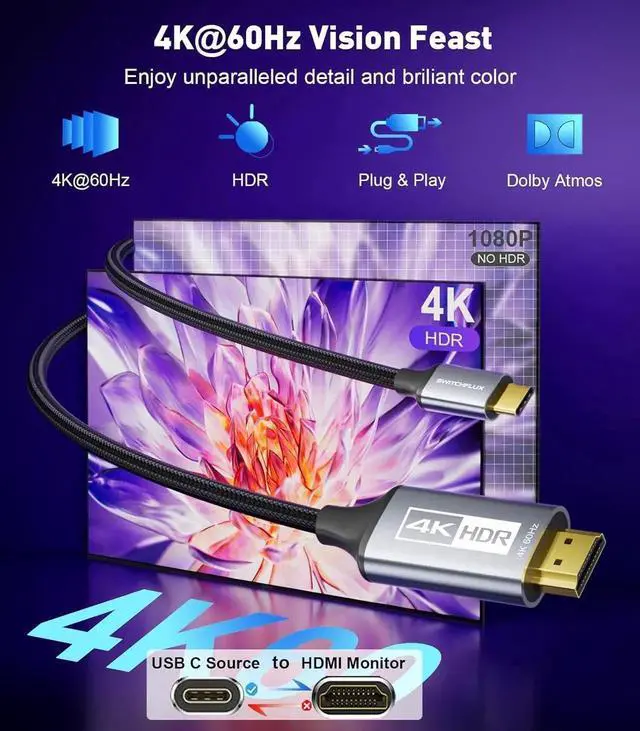 Amazing 4K Visual EffectsThe USB C to HDMI cable supports up to 3840*2160@60Hz resolution for extraordinary HDR visual clarity at smooth 60Hz in stunning 4k UHD resolution with perfect audio pass-through to immerse you in true cinematic enjoyment. Backward compatible with 3840*2160@30Hz 2K@120Hz 1080P.