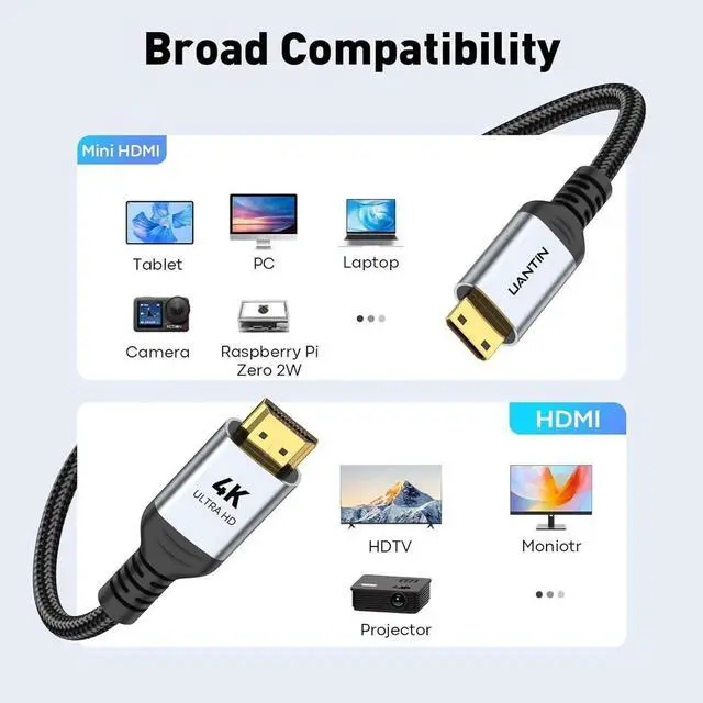 Wide Compatibility & Plug-and-PlayThis Mini HDMI Cord works for HDTVs GeForce GT 430 Graphics Card Camcorder for NVIDIA SHIELD Tablet K1 for Viking Pro 10 NUC Barebones Desktop etc.. Compatible for Raspberry Pi Zero for Pi zero w for D3200 for Canon EOS 90D and more. NOTE Please make sure your device has mini HDMI port NOT micro HDMI or micro USB. Durable & Double ProtectionThe mini HDMI cable features a high-quality aluminum housing that is sturdy wear-resistant and provides effective heat dissipation. The gold-plated connectors not only resist oxidation and corrosion but also minimize signal attenuation.