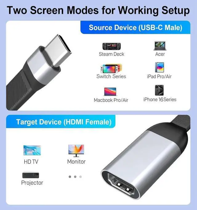 Please note: The transmission is one-way only from the USB-C host device to the HDMI display. [Compact and Durable Design] The USB-C to HDMI adapter for monitors is small and lightweight. Its aluminum casing offers excellent heat dissipation and wear resistance. The compact and lightweight size allows you to put it in your laptop bag. It is suitable for business trips and various devices. [Wide Compatibility] USB-C is compatible with various systems and devices. It can seamlessly connect to MacBook Pro/Air iPhone 16 Pro/Max iPhone 15 Pro/Max iPad Pro/Air Steam Deck and Thunderbolt 3/4/5. The HDMI 2.0 port supports high-definition TVs monitors and projectors including Windows Mac OS iPad OS and Linux.
