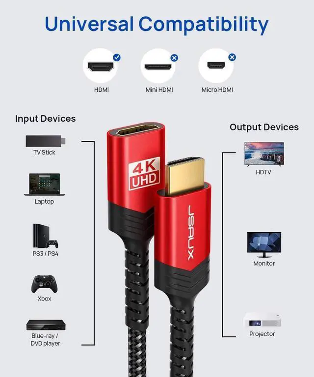 Widely Compatibility: JSAUX HDMI male to female extender can extend the connection between UHD TV HDTV monitor projector or other display and HDMI source devices such as TV stick DVD/Blu-ray players PS4/PS3 computers etc. Perfect 3.3 ft length The perfect length 3.3 ft of this nylon braided could enlarge the scenes in your daily life. Besides the scenes of other shorter cables applied for you could also connect your devices to your TV while siting on a coach or bed at home or in a hotel.