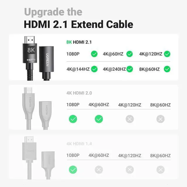 Upgraded Extension Cable: 8k/10K HDMI 2.1 extension cable is an upgraded version of the 4K HDMI 2.0 extender. It can not only realize all the functions of the 4k extension cable (4K@240Hz 4K@60Hz etc. ) but also solve the problems of a flickering screen insufficient bandwidth and other issues when using the 4k HDMI extension cordUltra High