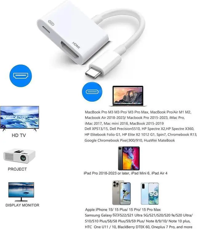 Wide Compatibility: This Type C HDMI Converter adopt MFi Certified Hiph-performance Chip Compatible with iPhone 16 Series/ 15 Series MacBook Pro M3 M3 Pro/M3 Pro Max MacBook Pro 2016-2024 or later MacBook Air 2018-2024 or later iMac M3 iMac 2017 or later iPad Pro 2018-2024 or later iPad Air 2020 or later XPS 17/15/13 Galaxy S24/S23/22/S21/S20 Note 20/10/9 Tab S9/S8/S7 LG V40/V35/V30/V20 Surface Book 2/3 Surface Go/Go 2 Surface Laptop Go/ 3 and more.