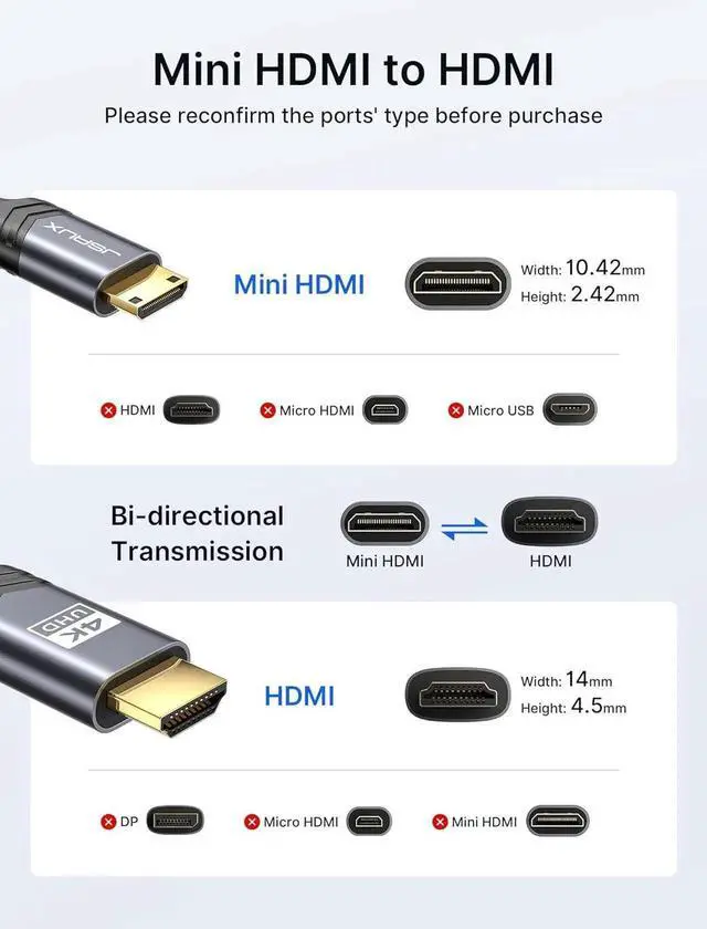 Bi-Directional Mini HDMI Transmission: NOTE Please make sure your device has mini HDMI port NOT micro HDMI or micro USB. Supports mini HDMI to HDMI & HDMI to mini HDMI. It can help you to stream audio and video from a camera camcorders tablet graphics cards or laptop through the mini HDMI Port to your HDTV or projector with HDMI portFit for Mini