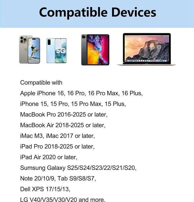 Wide Compatibility: This Type-C HDMI Converter adopt MFi Certified Hiph-performance Chip Compatible with iPhone 16 Series/ 15 Series MacBook Pro M3 M3 Pro/M3 Pro Max MacBook Pro 2016-2025 or later MacBook Air 2018-2025 or later iMac M3 iMac 2017 or later iPad Pro 2018-2025 or later iPad Air 2020 or later Galaxy S25/S24/S23/22/S21/S20 Note 20/10/9 Tab S9/S8/S7 XPS 17/15/13 LG V40/V35/V30/V20 and more.