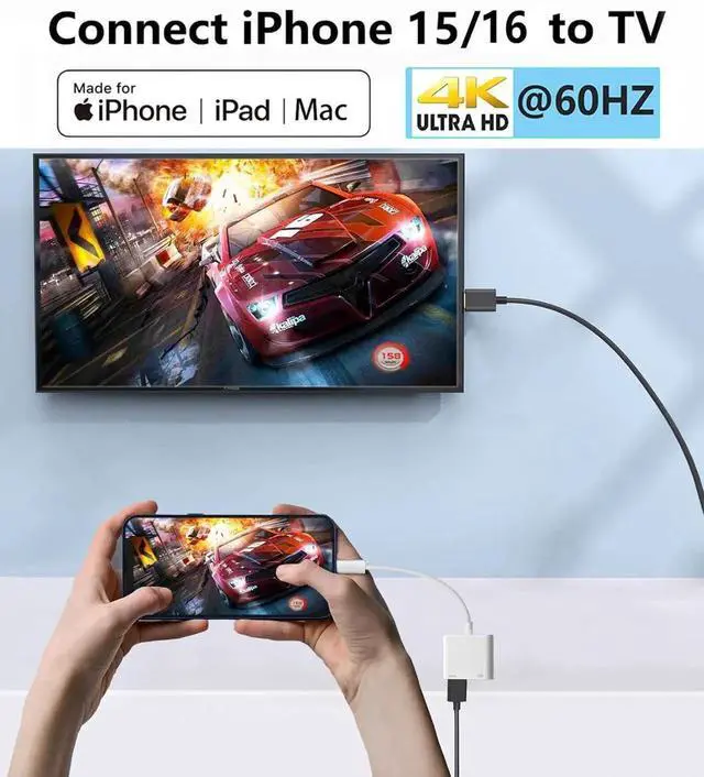 HDMI Adapter: with MFi Certified chips expands your iPhone 15/ 16/ Macbook/ iMac/ iPad Pro to TV / Projector / monitor. Support high refresh rates up to Ultra HD 4K@60Hz. Perfect for home-theater entertainment office exhibition presentation teaching video streaming playing games etc.