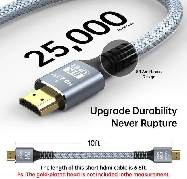 Reinforced classic high-quality materials This 8K HDMI Cord uses most popular classic style with a new smart chip making it reach an unprecedented height. The strength of the aluminum alloy shell and the tail's anti-bending design has been upgraded to make it more durable. The plug part is still made of 24K gold-plated material which accurately transmits signals. The military grade tensile nylon material also greatly extends its life. The ultimate perfectionistUltra High Speed HDMI Cable was made at the factory. Every cable and even every part has been put through rigorous testing. We've combined every flawless part into a perfect 8K cable.