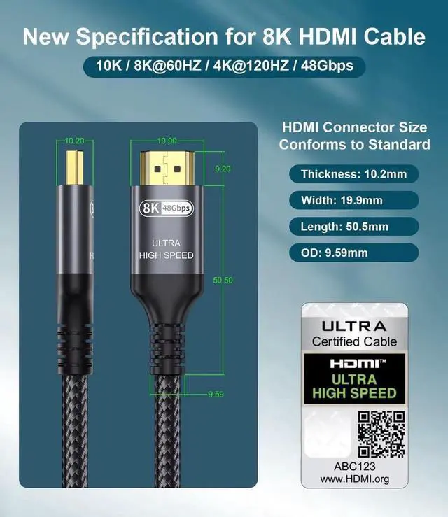 Supported resolutions and frame rates: Adauxter HDMI 2.1 cable is hdmi to hdmi cable Support 10240 X 4320 10k@60Hz; 7680 X 4320 8k hdmi cable 8K@60Hz; 5120 X 2880 5K@100Hz/5K@120Hz; 3840 X 2160 4k hdmi cable 4K@240Hz/4K@165Hz/4K@144Hz/4K@120Hz2560 X 1440 1440P1920 X 1080 1080PExcellent performance and authoritative certification: 48Gbps Ultra High Speed HDMl Cable with Ethernet hdmi cable achieving delay-free uncompressed audio and video transmission; support for uncompressed 8K video with HDR; Officially certified HDMI cables in line with industry standardsHDMI cable for game enthusiasts: Supports dynamic HDR HDR10+ HDCP 2.2 and 2.3; supports 12 bit color depth and wide color gamut; equipped with eARC supports