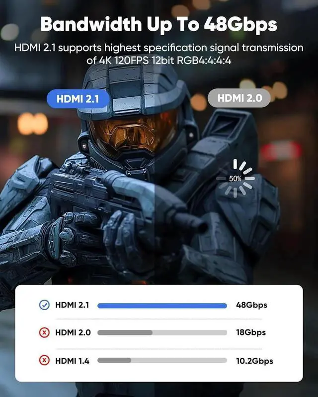 Cable: With a 48 Gbps bandwidth this cable supports 8K@60Hz 4K@120Hz and 2K@240Hz along with enhanced Audio Return (eARC) HDCP 2.2 48-Bit Deep Color 21:9 aspect ratio offering a top-tier audio-visual experience4K@120Hz