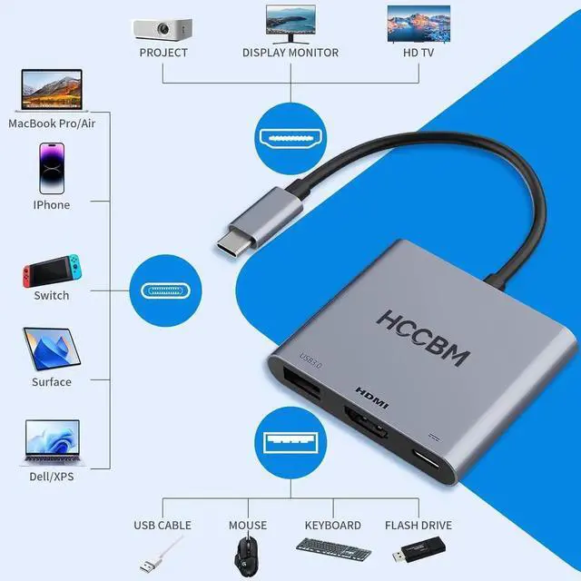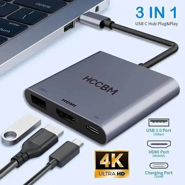 USB C to HDMI Monitor adapter (3 IN 1) This USB C adapter equipped with a 4K HDMI output a 100W PD charging port and a USB-A 3.0 port. 3 ports can be used simultaneously. It is an ideal usb c accessories for entertainment learning daliy work and traveling. Easy-SettingThis Multi-port USB C adapter just plug and play no need to install any driver/software. With Advance chip this hdmi adapter support all new usb-c/type c/thunderbolt 3 laptops with DP Alt Mode on usb c port performace more stable. Aluminum Plate for strong antioxidant capacity.