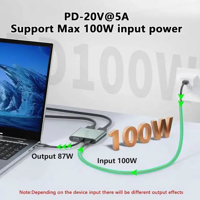 Specs-USB-C Female port: PD-20V@5A Support max 100W power adapter (input) /USB-C male: Compatible with thunderbolt 3 Make sure that thehost USB-C porton your device comploes with the USB 3.0 / 3.1 / 3.24 -in-1 Ultra-Portable Hub-The compact aluminum body packs dual HDMI ports +