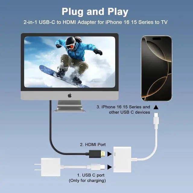 USB C to HDMI for iPhone 16 to TV This USB C HDMI adapter for iPhone 16 Pro Max allows you to mirror your Mac Display to your HDMI-enabled TV or display. The iPhone 16 hdmi adapter to tv enjoy stunning 4K video and audio quality on a larger screen with zero lag or quality loss. Widely Compatible This Type-C HDMI Dongle compatible with iPhone 16/16 Plus/16 Pro/16 Pro Max/15/15 Plus/15 Pro/15 Pro Max MacBook/Pro/Air iPad Pro 2018-2023 iMac 2017-2023 Galaxy S24/S23/S22/S21/S20/S10/Note 20/Note 10 series Pixel 8/7/6/5/4/3/2 and more usb c devices. Plug and Play Seamlessly connect your iPhone 15 16 series to any HDTV projector or monitor with this USB-C digital AV multiport adapter No external power supply is required simply connect the USB C to hdmi adapter to the USB-C or Thunderbolt 3 (USB-C) port on select models then connect it to your TV or projector via the HDMI cable to begin mirroring your iPhone display.