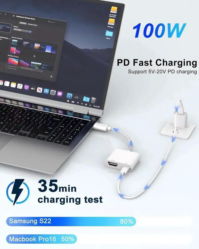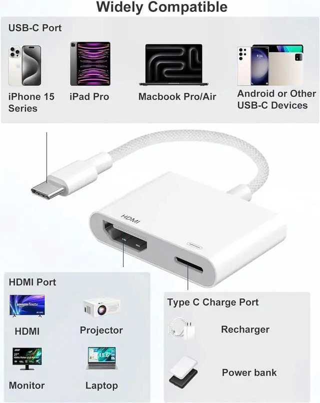 HDMI inputCrystal-Clear Visuals: Digital AV Adapter enjoy stunning 4K video output at 60Hz for an immersive viewing experience with vivid colors and sharp details. Type c to hdmi adapter port provides 100W of fast charging for USB C devices ensuring that your device has enough power when projectingPlug-and-Play