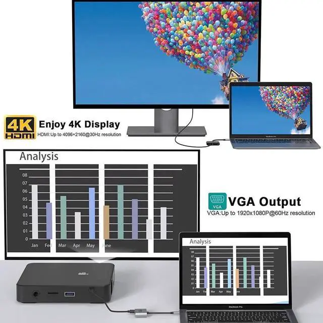 Dual Monitors Display: USB C VGA HDMI Adapter is design to mirror or extend the screen of laptop HDMI and VGA port work simultaneously; Allow you to connect hdmi/vga port monitors displays tvs.