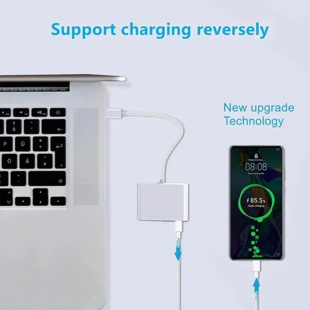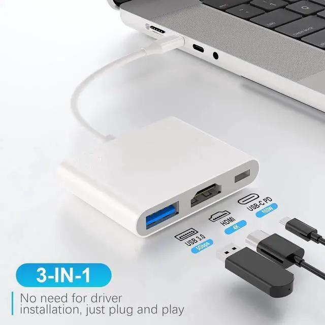 USB-C Digital AV Multiport AdapterUSB C to HDMI Multiport adapter expands USB port of laptop to a HDMI 4K@60Hz output port a PD fast charging port and a USB-A 3.0 port. Support mirroring of what is displayed on your iPhone 15/16 or iPad Pro screen to TV projector monitor. All ports can be used simultaneously. 100W Fast Charging with Data Syncing Our HDMI Adapter for Iphone used latest technology. The USB-C PD port not only supplies 100W fast charger forward but also supports fast charging with data transfer reversely. Then you can charge for your cellphone when use tablets/laptop or connect usb c devices to sync data.