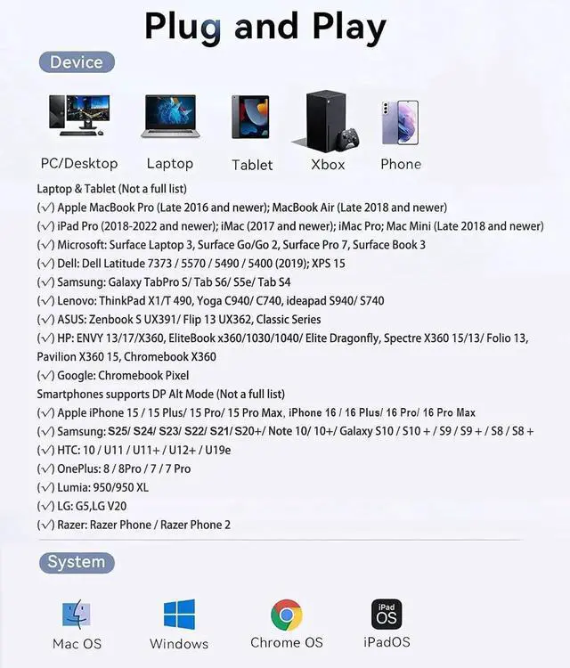 Widely Compatible: This Type-C HDMI Dongle compatible with iPhone 15/ 15 Plus/ 15 Pro/ 15 Pro Max 16/ 16 Plus/ 16 Pro/ 16 Pro Max MacBook M3/ M3 Pro/ M3 Pro Max MacBook Pro 2015-2025 Macbook air 2018-2025 iPad Pro 2018-2025 iMac 2017-2025 Galaxy S25/S24/S23/S22 Ultra 5G/S21/S20/S20 fe/S20 Ultra/S10/S10 Plus/S8/S8 Plus/S9/S9 Plus/ Note 8/9/10/ Note 10 plus Surface Book 2 XPS 13/15 Spin7 Chromebook R13 Yoga 900/910 Google Chromebook Pixel HP Spectre X2/X360 etc. USB-C 100W