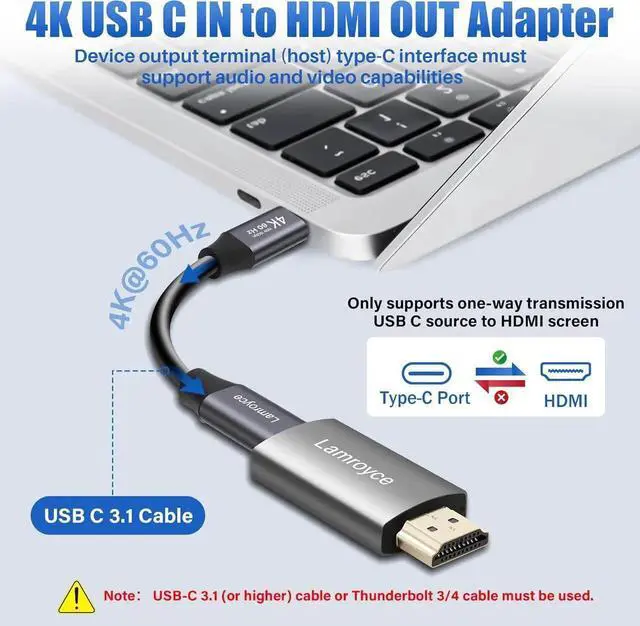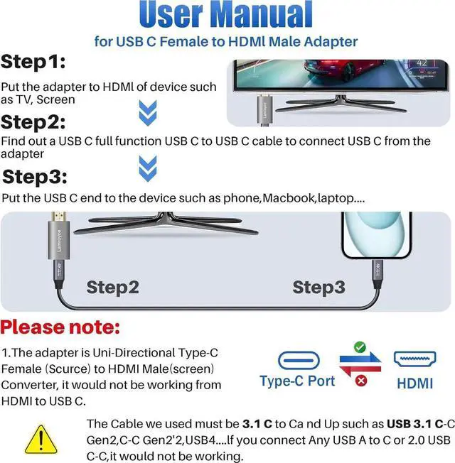 Please Note: The adapter is unidirectional only from USB C (source) input to HDMI (Display) output. Connect the HDMI male Plug to the receiving device (screen) and connect the USB Type-C female port of the adapter to the USB C cable signal source (such as laptop phone tablet).