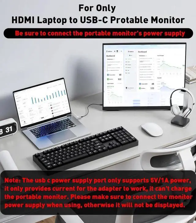 Please note: The adapter cannot be used with any Hub/Dock/KVM. Please make sure the USB-C input monitor supports DP Alt Mode video input function otherwise you can't get the image. USB power supply is only for cable compatibility it can't charge USB-C portable monitors/Steam etc. Not compatible with Studio DisplayWide CompatibilityNot Compatibility with Dock/Hub/KVM. HDMI male to USB C female adapter Compatible with all kinds of smart glasses:?