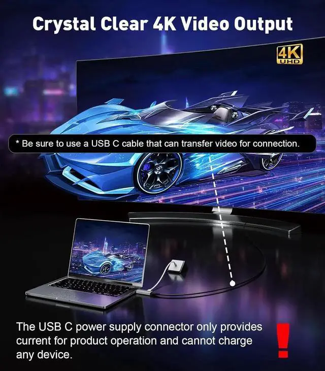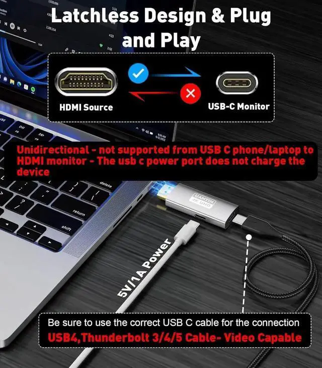 Working PrincipleBe sure to use the USB4 Thunderbolt 3/4/5 cable for connecting the adapter to the monitor. This HDMI to USB C adapter only supports transfer from HDMI source device to USB-C display device. Please plug the HDMI male connector into a source device equipped with HDMI port such as laptop PS5 Xbox TV box etc. and connect the USB-C female connector to the monitor Xreak Air Nreal Air Rokid etc. display device using a usb c cable with specification of USB4 Thunderbolt version 3/4/5Amazing 4K ClearnessThe Type C power port only supports the working use of the product and cannot charge the device.