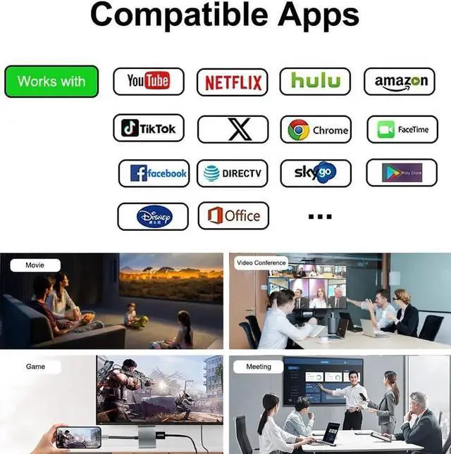 Apps Supported: This USB C to HDMI connector Compliant with HDCP 2.2 that supports mirror videos from Apps such as compatible with YouTube Netflix Prime video Directv Disney Mediaset HBO go HULU Quickflix Hulu Plus IDMB Family On TV ABC NBC FOX Office and other streaming apps.