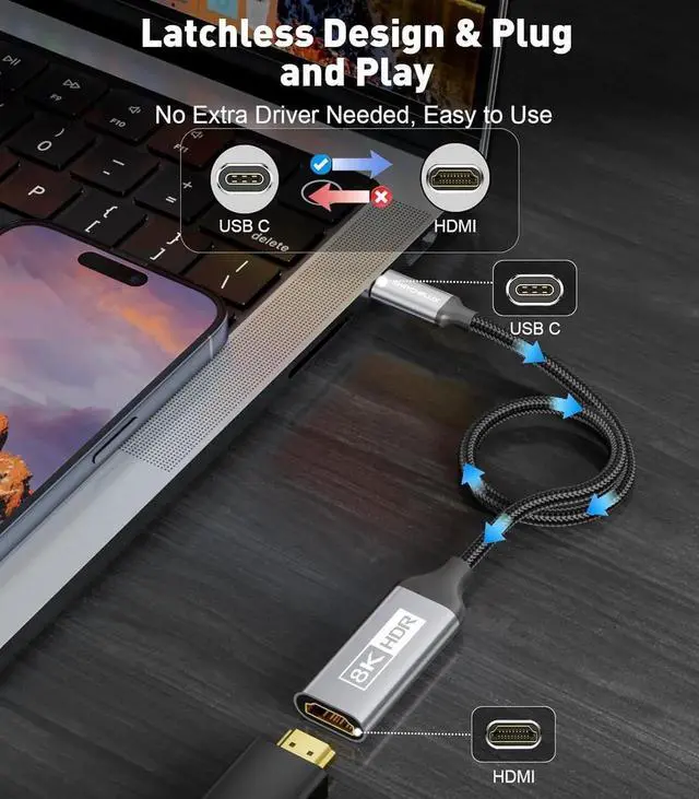 Leading 8k ResolutionUSB C to HDMI adapter supports up to 8K30Hz resolution which is four times the resolution of 4K the picture looks sharper and more detailed connect to monitors with HDMI ports for a bigger screen experience backward compatible with 4K@144Hz 4K@60Hz 4K@30Hz 2K@165Hz.