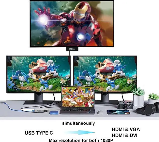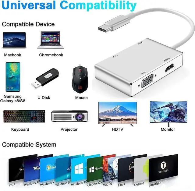 4 in 1 USB C Hub - Our usb C hub convert usb 3.1 type c to HDMI VGA DVI USB 3.0 Multiport support most monitors projectors HDTVs and screen Massive Expansion plugs all in one portable and convenient. Plug and Play Ideal for Office Conference Presentation Home-theater entertainment4K High-resolution Output - HDMI & DVI output support up to 2K*4K resolution (3840 x 2160 @ 30 Hz); backwards compatible to 1080P and 720P. Mirror or extend your screen and directly stream Full HD 1080p (1920×1080) video to HDTV/ monitors/projector and other devices with HDMI/DVI port. Multiple Videos Output Simultaneous - HDMI & VGA DVI & VGA ports can work at the same time but the max resolution is 1080P while they works at the same time but the two external monitors will show the same image.