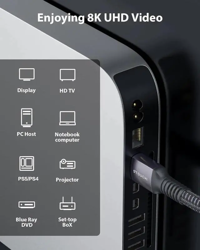 DTS Master DTS: X and Dolby Atmos providing an immersive experience tailored for OLED displays[ Elevated Viewing Enjoyment ] 8K HDMI Cable elevates your viewing experience with advanced technologies like SBTM Variable Refresh Rate (VRR) Quick Media Switching (QMS) and Auto Low-latency Mode (ALLM). Say goodbye to screen tearing and stuttering[ Robust Construction ] HDMI Cable 2.1 boasts a gold-plated connector for stable signal transmission. 30AWG copper wire and triple tin shielding interference is minimized. The nylon braided cable ensures superior durability even with frequent plugging and unplugging[ Universal Compatibility ] The HDMI 2.1 Cable is compatible for your Streaming Devices PlayStation 5 (PS5/PS4) Xbox Series X TV 4K Mac mini M4/M4 Pro 2024 Macbook Pro 14/16( M1 Pro/Max) NVIDIA SHIELD TV Fire TV Ultra TV Blu-ray players Xbox 1 and other HDMI-enabled devices to your HD TV monitors displays or projectors