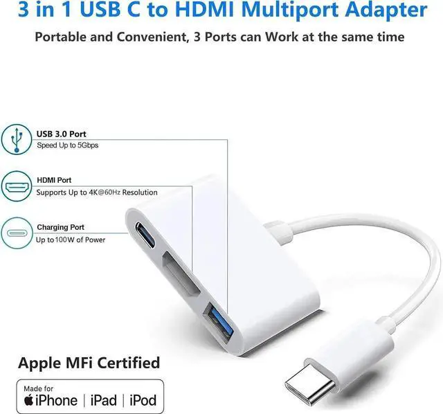 Multiport Adapter: Expands your iPhone 15/Macbook/iPad Pro/iMac/computer/laptop which with USB-C ports into a 4K HDMI output port a USB 3.0 port a USB-C charging port. Three ports can work at the same time. Perfect for home-theater entertainment office exhibition presentation teaching etc. Ultra HD 4K 60Hz