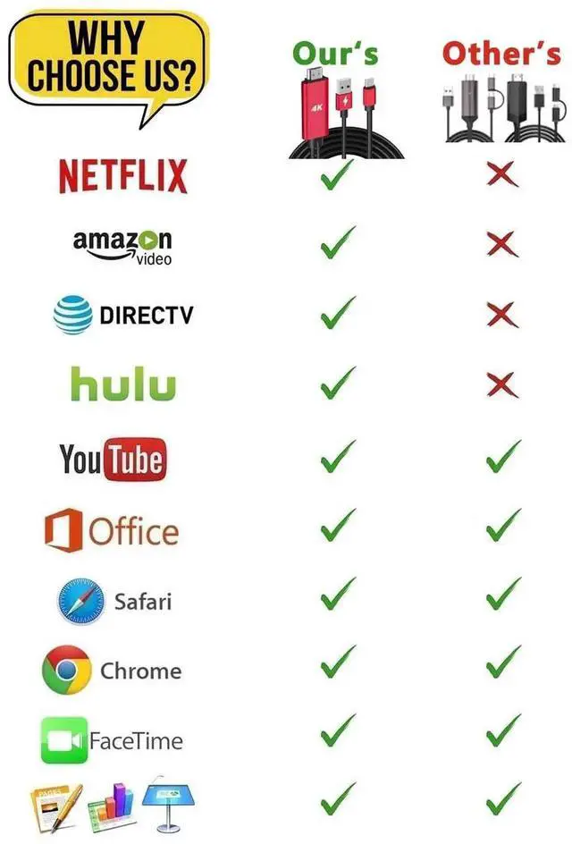 Enjoy casting your phone or tablet to tv monitor projector or other the display. Phone to HDMI Adapter for TV - Plug and Play without Any Driver/ Software/ APP needed as well as Personal Hotspot / WiFi or Bluetooth; Supports video calling from FaceTime Skype WhatsApp and streaming videos pictures games slideshows on Facebook YouTube Instagram Twitter Reddit Pinterest Snapchat IDMB Office etc. Let you have a great experience on your mobile world playing phone game on tv working with projector & even driving with car play. MHL to HDMI Lag-free HDMI Video Cable for Type C Phone - Compatible with Apps which have HDCP video copyrights protection like Netflix iTunes movies video HBO go HULU and Honda motor YouTube Hulu Plus IDMB Quickflix Family On TV ABC NBC FOX Office and more videos downloaded and saved on your IOS and dex devices (cell phones & tablets )