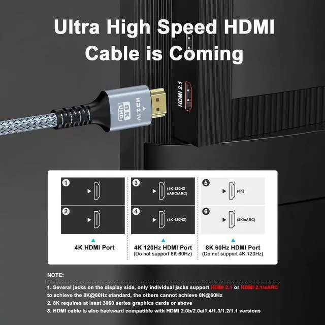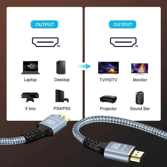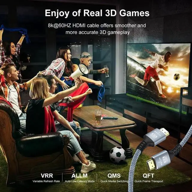 It is also backward compatible with HDMI 2.0 b/ 2.0 a/ 1.4 / 1.3 / 1.2 / 1.1 versionsFor Game Enthusiasts This 8K Ultra High Speed HDMI Cable is not limited to 4K@60HZ it can break through 4K and achieve 8K ultra-high image quality. It can also achieve a super smooth picture of 4K@120HZ. Its latest game mode supports variable refresh rate maximizes the value of the graphics card and CPU and is more accurate in the processing of rendered images. When the scene is switched the refresh rate will change accordingly to obtain a smoother and more detailed picture.