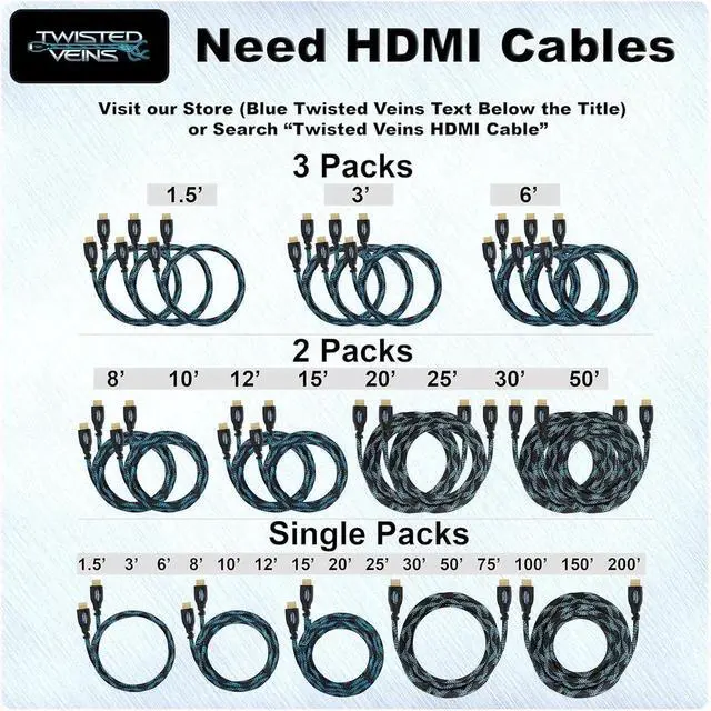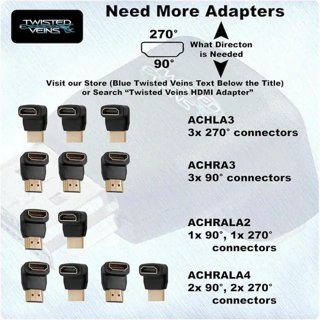 Package includes: One or more cables (see title) One 270° left angle adapter and Three easy-re-closable micro fiber cable ties. Twisted Veins Cables come with a lifetime guaranty.