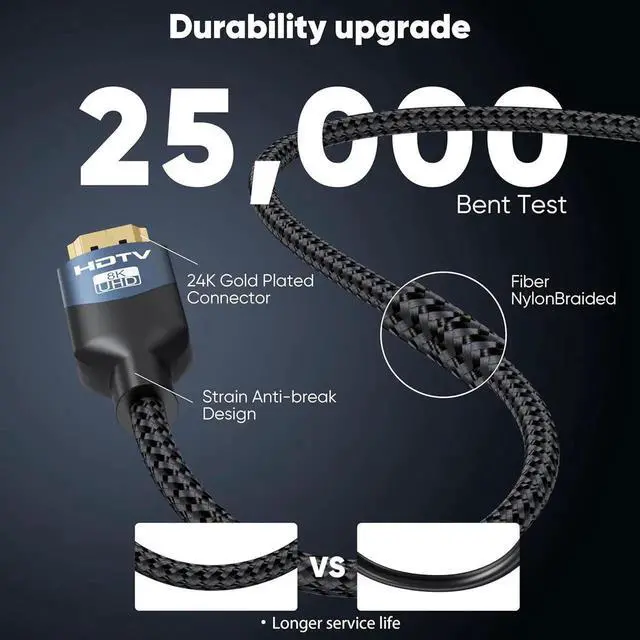 Real 8K HDMI 2.1 CableOur HDMI cables support high resolution 8K@60Hz (7680*4320). It smoothly supports 4K@120Hz & 2K@240Hz ensuring a smooth and low-latency viewing experience. Compatible with HDMI 2.0 / 1.4 / 1.3 / 1.2 / 1.148G bps Ultra High SpeedOur HDMI 2.1 cord meets the standard HDMI 2.1 48Gbps 3 times faster than 4K Visual. Supports HDCP 2.2 & 2.3 Dynamic HDR (HDR10+) SBTM Enhanced Audio Return Channel (eARC) Variable Refresh Rate (VRR) Quick Media Switching (QMS) Quick Frame Transport (QFT)