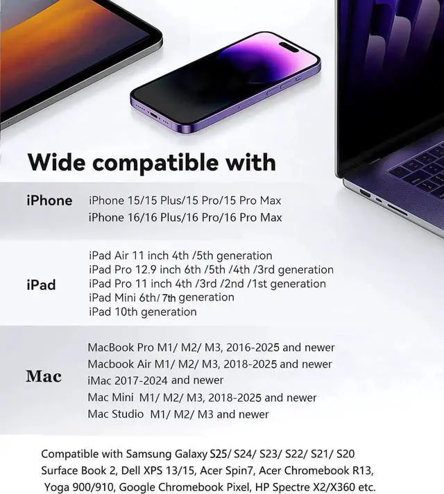 Widely Compatible: This Type C HDMI Dongle is compatible with iPhone 15/15 Plus/15 Pro/15 Pro Max 16/16 Plus/16 Pro/16 Pro Max MacBook M3/M3 Pro/M3 Pro Max MacBook Pro 2015-2025 MacBook Air 2018-2025 iPad Pro 2018- 2025 iMac 2017-2025 Galaxy S25/S24/S23/S22 Ultra 5G S21/S20/S20 fe/S20 Ultra/S10/S10 Plus/S8/S8 Plus/S9/S9 Plus/ Note 8/9/10/ Note 10 plus Surface Book 2 XPS 13/15 Spin7 Chromebook R13 Yoga 900/910 Google Chromebook Pixel HP Spectre X2/X360 etc.