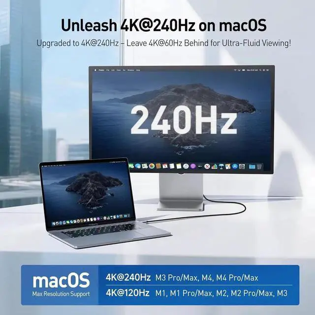 Other Devices: Unlock the full potential of your laptop with the Cable Matters USB-C to HDMI 2.1 cable. Featuring custom firmware designed for macOS this USB C to HDMI cable supports 4K@120Hz on M1 M1 Pro/Max M2 M2 Pro/Max and M3 chips and up to 4K@240Hz on M3 Pro/Max M4 and M4 Pro/Max. Also fully compatible with Windows and other operating systems it's ideal for high-performance gaming content creation and ultra-smooth streaming. Incredible 8K@60Hz / 4K@240Hz
