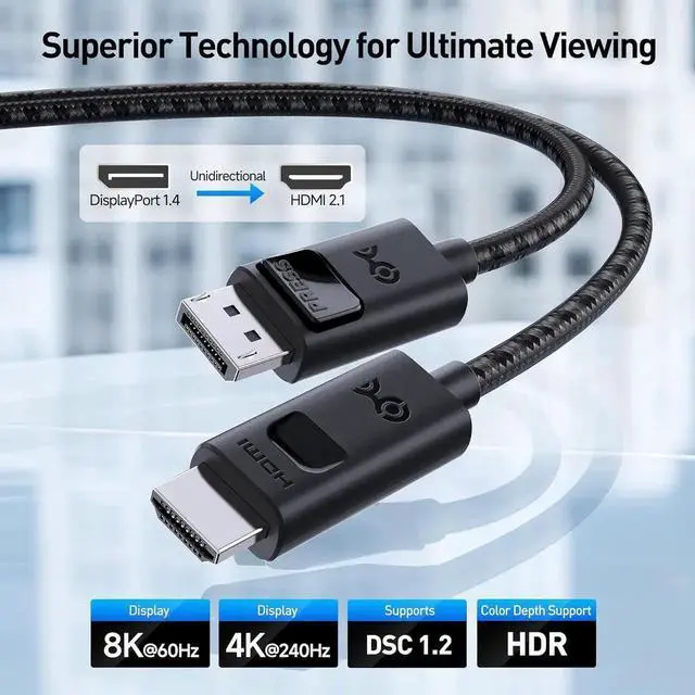 DisplayPort Connection: Elevate your digital experience with our 8K HDMI 2.1 to DisplayPort 1.4 cable seamlessly connecting DisplayPort sources to HDMI displays. This cable supports the latest standards for unmatched resolution.