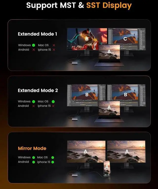 Mirrored Display: For windows systems this Type-C to HDMI Converter supports extended mode (ABB mode & ABC mode) allowing you to tailor your display setup. In Mac OS systems this USB-C to 2 HDMI adapter not support MST ABC mode but does support extended ABB mode (both external HDMI outputs display the same picture) and copy mode. However please note that for Android and other Os systems with a Type-C port only screen mirroring is supportedWide