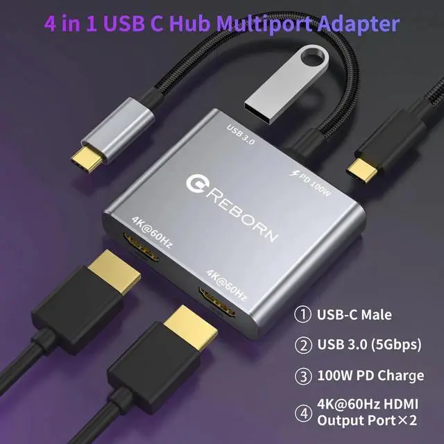 Dual 4K DisplayFor devices supporting DP Alt Mode 1.4 output content to two displays simultaneously at resolutions up to 4K@60Hz. If your device only supports DP Alt Mode 1.2 the maximum resolution for dual displays is 4K@30Hz. With this Reborn USB C to Dual HDMI Adapter you can enjoy vivid visuals on dual screens. Its a 4 in 1 USB C Hub Multiport Adapter featuring dual HDMI ports a USB 3.0 port and 100W PD charging functionality. Ideal for MacBook Yoga Thinkpad XPS etc. macOS only supports Single-Stream Transport (SST) mode for this adapter.