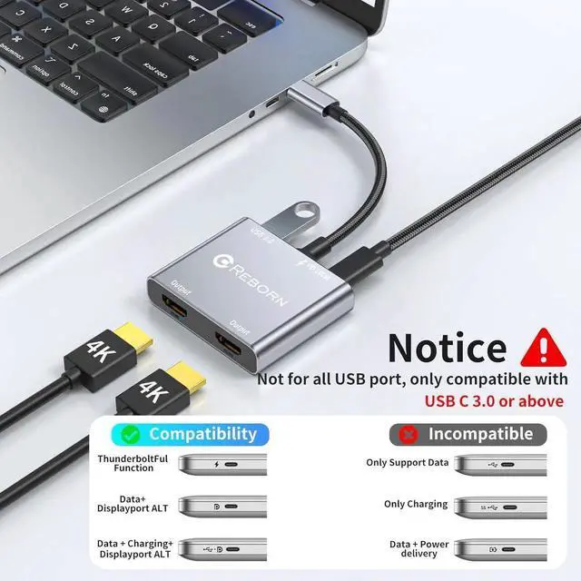 Note: Adjust the Default Audio Output Device in System Preferences for sound. Wide CompatibilityThis HDMI splitter for dual monitors supports USB-C USB4 and Thunderbolt. Works with MacBook (macOS 12+) Windows 10/11 ChromeOS and DP Alt Mode laptops. Compatible with devices like MacBook series iPad Pro iPhone 16/15 Chromebook HP and more. Plug-and-play for easy dual - monitor use. What You GetReborn USB C hub multiport adapter designed for seamless use with a wide range of USB-C devices. Enjoy peace of mind with our 24-month unconditional return or replacement guarantee along with round-the-clock customer support. If you have any questions feel free to reach out.