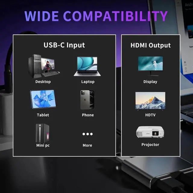 Important: Compatible only with Thunderbolt 3/4/5 full-featured USB-C or USB4 ports and requires a standard HDMI cable for connection.