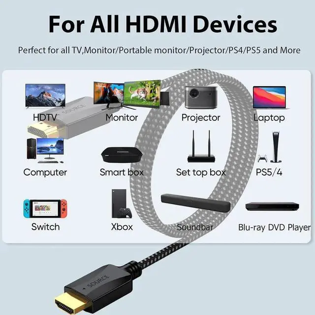 Hz) include: 2160p 1440p 1080p 1080i 720p 480p UHD FHD HD Ultra HD TrueHD 3D 2K etc for 4K TVs and monitors NOT for 8K. Wide CompatibilityThe hdmi cord support signals up to 18Gbps bandwidth 4K resolution 60hz refresh rate and HDR10. HDMI cables have been tested and work with Ultra PS4 Pro Xbox One X Playstation 4 (PS4) Playstation 3 (PS3) Xbox One S Xbox One Xbox 360 Nintendo Swtich Nintendo WII Blu-Ray Players Ultra HD Blue-Ray Players High End Video Graphic Cards etc. Perfect Conform to HDMI 2.0 VersionThis HDMI 2.0 cable perfectly conforms to the latest hdmi 2.0 standard and is backward compatible with hdmi 1.4 hdmi 1.3 and hdmi 1.2. High quality hdmi cable construction with 100% copper core to decrease or eliminated the noise to improve the image quality and enhance the vision effect. Thinner and Lighter designThis hdmi cable adopt a lighter and thinner design it realizes the advantages of convenient carrying convenient use in a narrow space simple but delicate appearance simple operation. Longer LifeTwice Forming Die Casting and fabric braided nylon cable have undergone 20 000 bending tensile tests. Slim shell size frees you from the worry of getting in the way of nearby ports.