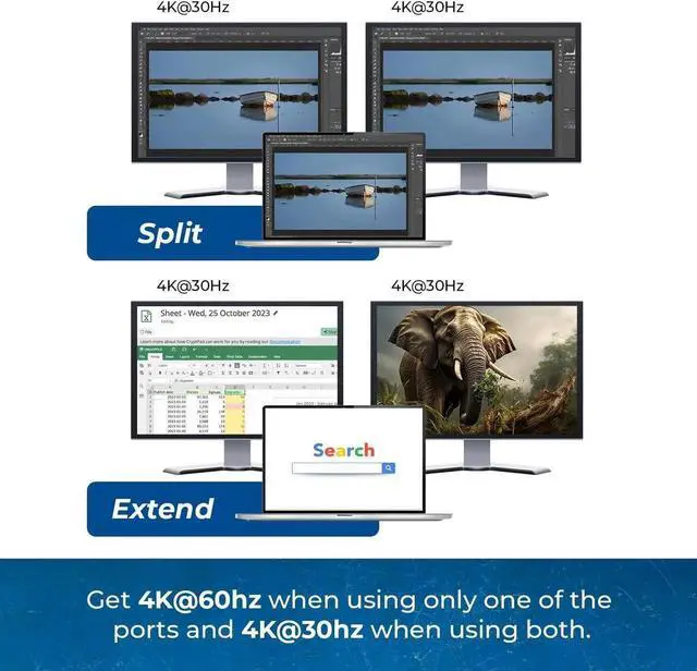 Mac OS: For Mac OS it only has mirror mode and cannot extend two different screens due to Mac OS limitation. SPLITEXTEND - Split and Extend your Monitor to work twice as fast. With this adapter you will able to plug 2 HDMI Monitor Display to your Laptop or Desktop to get Extended Display. It will allow you to display 3 separate screen including your laptop screen at 4K @ 30Hz Resolution.