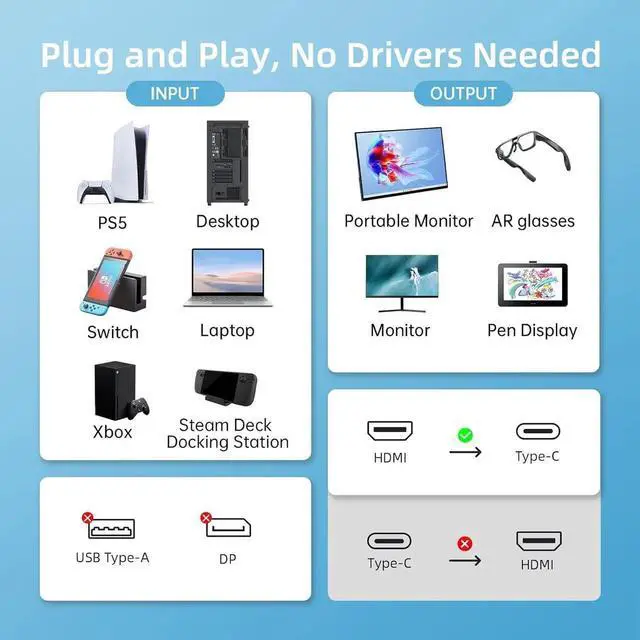 Note: The second generation of AR glasses may be incompatible). At the same time it can also be connected to a portable screen supporting touch operation audio and video synchronization and portable screen plug and play (only transmitting signals no power supply function) USB Power Plug and PlayPlug and play without the need to install drivers or software. This HDMI to USB-C adapter comes with a USB-A power port and does not require an external power cord. Insert the USB - A connector into a power source (computer or wall charger) for optimal performance and compatibility Material and Craftsmanship High quality cable materials are used which have good anti-interference properties effectively avoiding signal attenuation and external electromagnetic interference ensuring the integrity and stability of data transmission. Exquisite interface technology smooth insertion and tight fitting durable and long-lasting ensuring long-term stable use