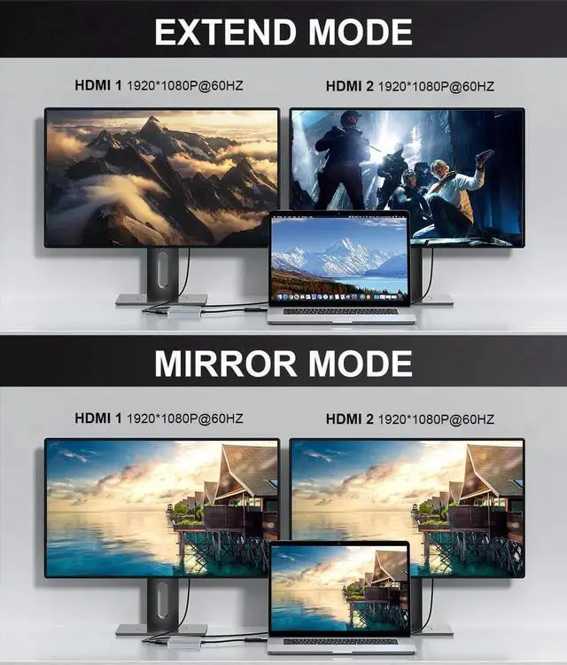 Multiple Monitors Supported: The USB to HDMI splitter for dual monitors supports Windows 11 10 Mac OS 10.15 or later for MacBook Air/MacBook Pro.