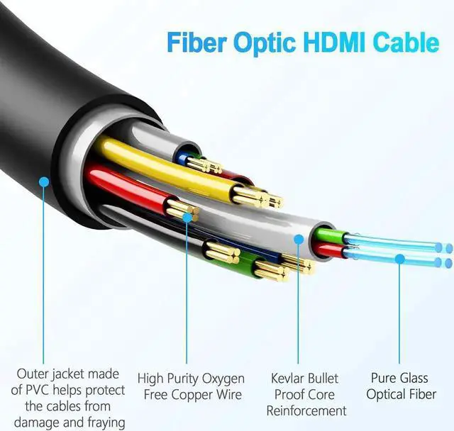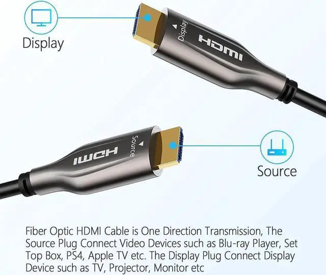 HDR10 YUV 4:4: 4 8bit HDCP 2.2 CEC EDID Dolby TrueHD 3D ARC etc. Fiber Optic HDMI Cable is One Direction Transmission The Source Plug Connects Video Devices such as --TV Fire TV PS4 PS3 4K Blu-ray Players XBox One XBox One S Ultra Laptop etc. The Display Plug Connects Display Devices such as TV Displays Projector Moniter etc. Copper HDMI Cable can't get 18Gbps after More Than 50 Feet. But Fiber Optic HDMI cable can Achieve and No signal delay. Plug and play No extra power supply Slim and flexible cable with bending radius more than 20mm for easy installation in tight areas. EVAIO is a brand dedicated to providing customers with high quality cables. In addition to specializing in the production and supply of cables with different interfaces EVAIO also offers a lifetime after-sales service for each customer. When you encounter cable failure in use please contact us via Buyer-Seller Messages our customer service team will reply you and provide technical support within 24 hours.