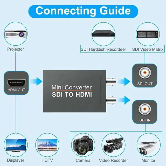 SDI to HDMI Converter Designed for SDI to HDMI Converter allows you easily display your work on common HDMI displays. The loop-through design also allows you to view the original SDI content on an SDI monitor simultaneous with the HDMI display. This converter supports bit rates up to 2.970 Gbps and supports SD-SDI, HD-SDI, and 3G-SDI video signals