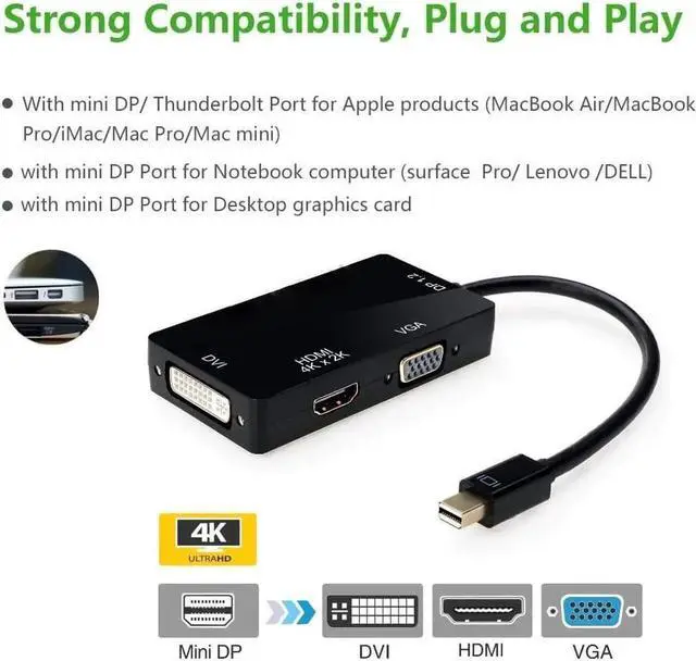 ENJOY GREAT DISPLAY: HDMI/DVI port support displays up to 3840x2160@30Hz (4K). Please use a HDMI 2.0 cable in order to enjoy the 4K resolution.VGA port support displays up to 1920*1200@60Hz,Therefore, mini displayport adapter is ideal for your office, home entertainment display, conference rooms, trade shows, and more.