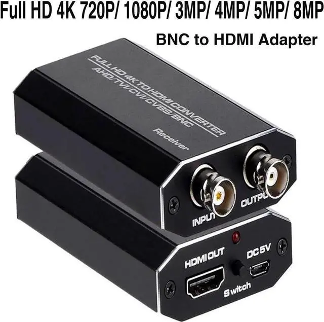 - TVI CVI AHD CVBS to 1080P HDMI Output: Plug and play; It converts TVI CVI AHD CVBS security camera signals to HDMI monitor. The HDMI Video output is 1080p/720P@60Hz resolution, You can select by the switch. And It have BNC Video Loop Out port, that you can connect multiple monitors.