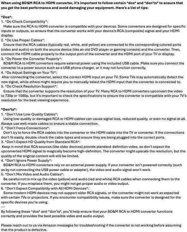 - Works only for RCA to HDMI (not HDMI to RCA).