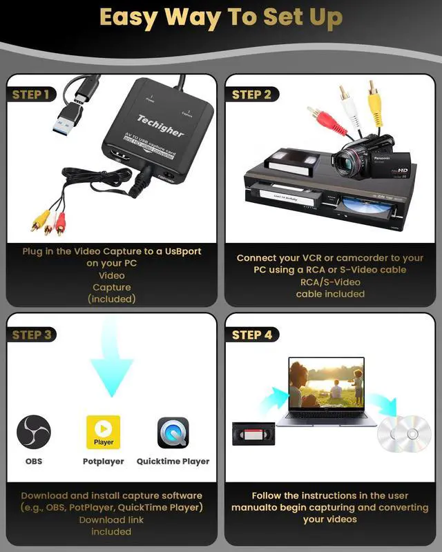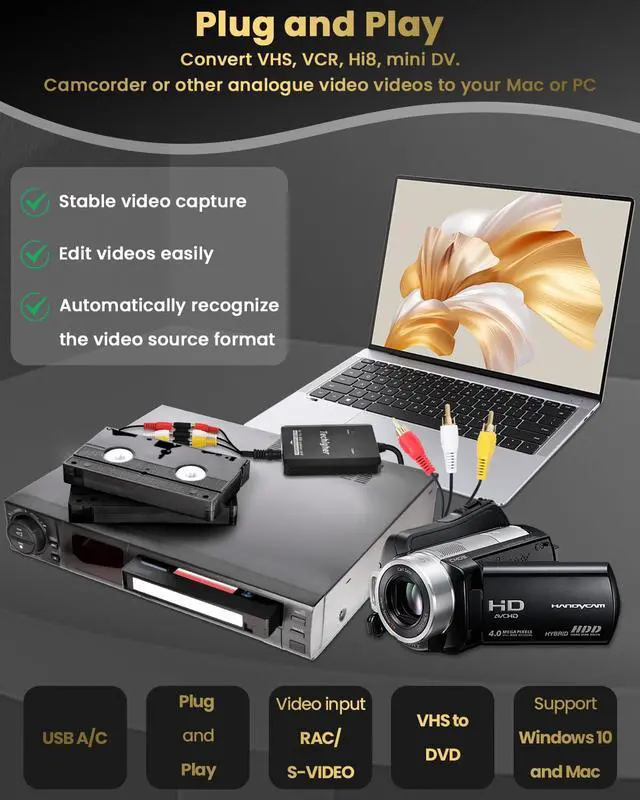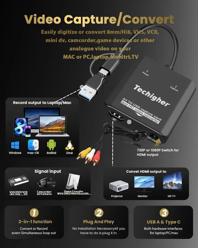 Work with WIN /Mac OS10.9 higher/Android,/Linux...support For PS2,PS3,Xbox,N64,STB, VHS, VCR, DVD Players and more with standard composite AV input.