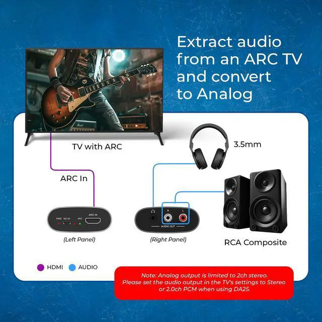 | Modern TV to Analog Audio | Basic Digital-to-Analog audio | ARC W/ Dolby downmix to stereo | Add headphones + Soundbar | Dolby Digital to Analog | Modern TV & Older Sound System |